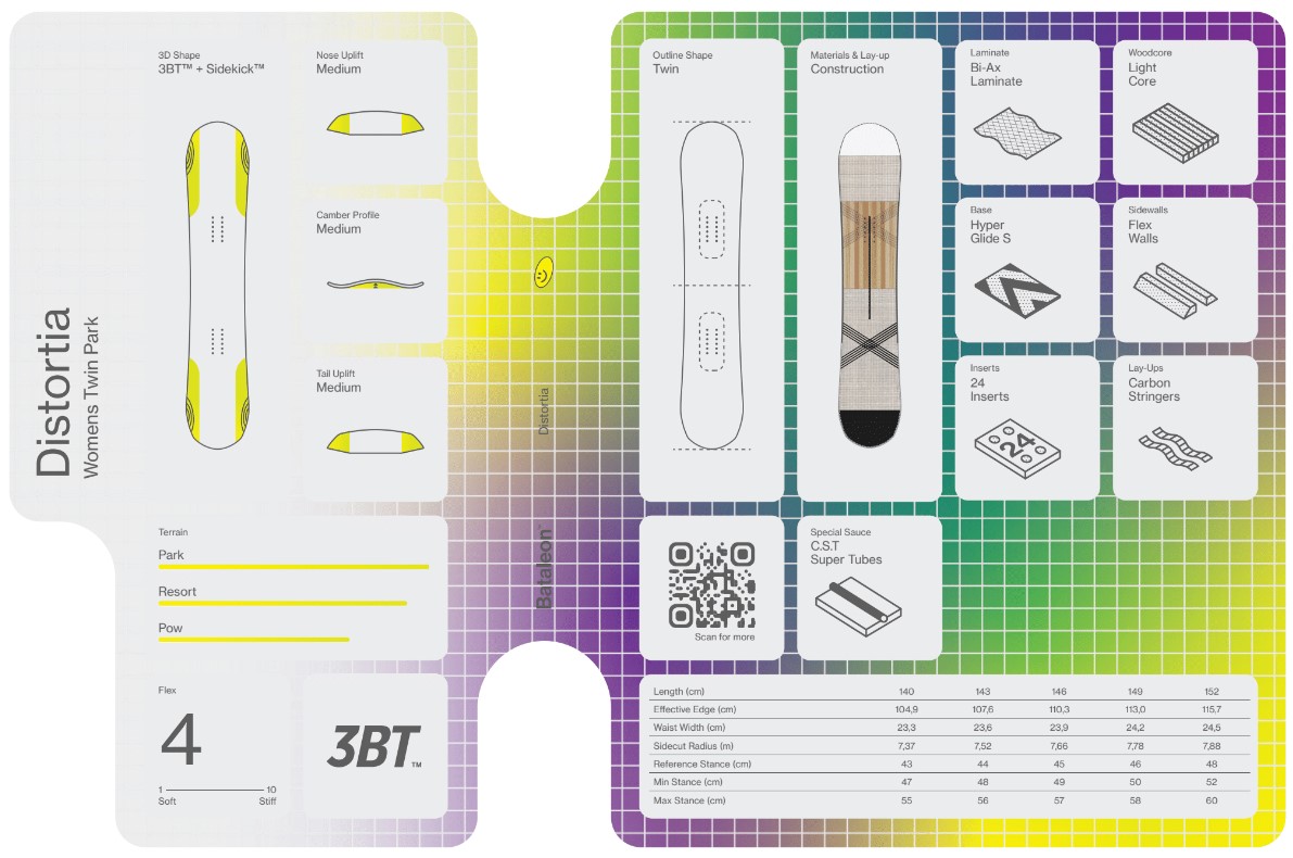 A lightweight women’s twin, the Distortia is ideal for pushing your park progression and taking on the whole mountain. Its symmetrical shape, twin flex and 3D base profile lets you ride switch, chuck spins and butter around without worrying about catching an edge. This is the board of choice for Klaudia Medlova.
