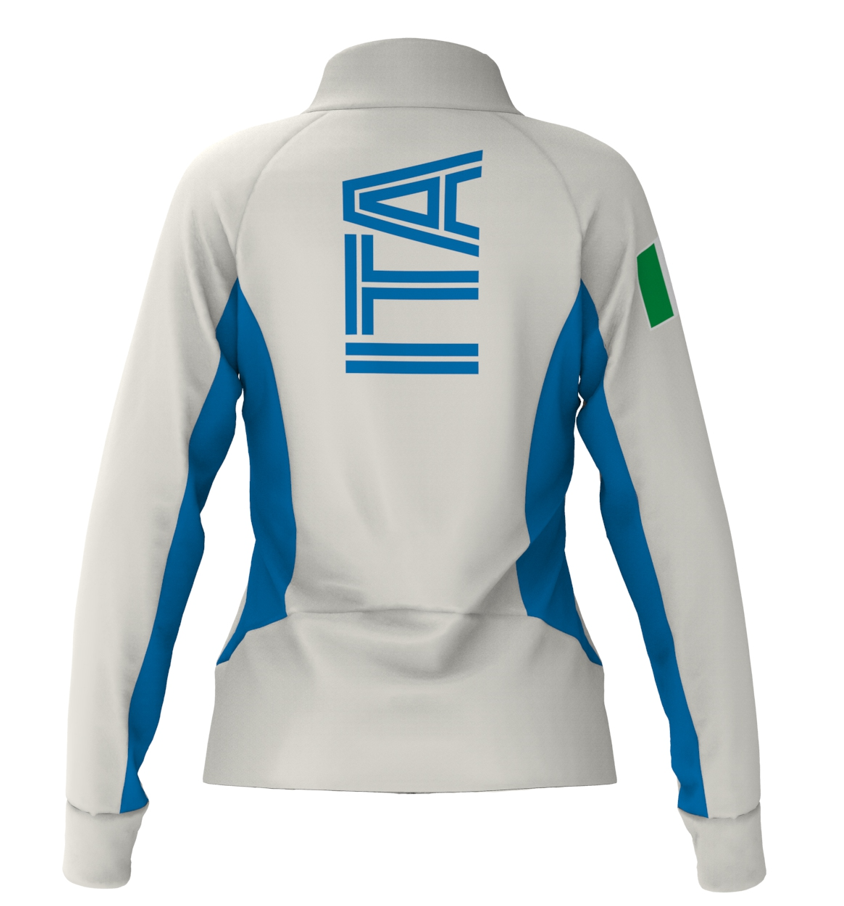 - Women's sweatshirt made of fleece fabric anti-pilling polyester, stretch fabric inserts. REGULAR FIT. Full zipper front opening, zippered pockets. Embroidered Omini logo and Italy personalization