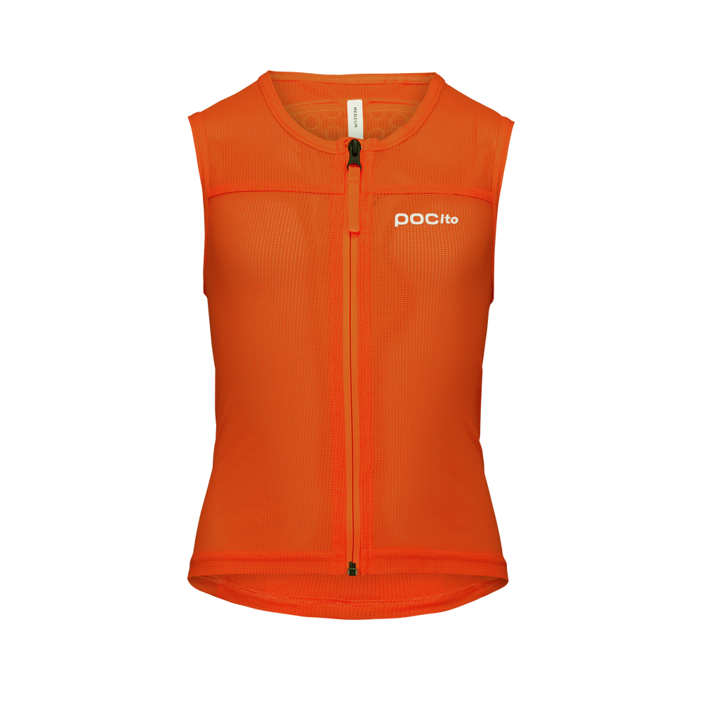 • POCito kids' vest with certified VPD Air back protection, breathable mesh, front zipper, and fluorescent colors for better visibility on the slopes.